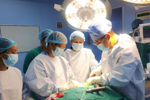 在這樣的條件下,我還完成了自己的首次手術教學。從鎖骨上神經的保護,骨膜的有限剝離,骨折的復位、臨時固定,鋼板長度的選擇,皮質骨螺釘、鎖定螺釘、拉力螺釘、位置螺釘的選擇及分布……我一邊手術,一邊跟同臺的伙伴講解手術的關鍵步驟和要點。