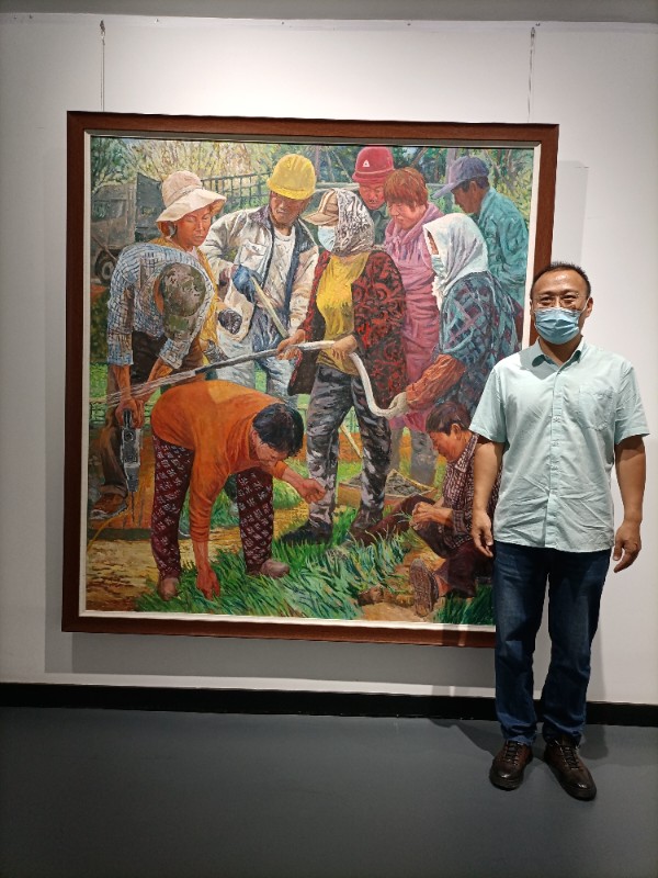 馬群作品《燃情花海》是一幅謳歌唐山花海建設(shè)者們頂烈日、撒汗水、愛勞動、繪豪情的后印象主義風(fēng)格的油畫作品。畫面用濃度極高的紅和綠,藍(lán)和橙對比色,形成濃烈的補(bǔ)色關(guān)系,大面積的藍(lán)綠色彩對比烘托出勞動者火紅的臉、燃燒的情。馬群把唐山花海施工建設(shè)時搜集的人物素材,包括澆花、種草、運(yùn)樹、注漿、木工等花海建設(shè)者的形象重新組合,用濃烈繽紛的油畫色彩描繪出花海建設(shè)者們?nèi)记榛ê5慕ㄔO(shè)場面,展現(xiàn)了唐山人民奮斗之力、創(chuàng)造之力、發(fā)展之果,傳遞出農(nóng)工黨黨員心系家國的赤子情懷,“永遠(yuǎn)跟黨走”的政治信念和獻(xiàn)禮中共二十大、農(nóng)工黨十七大的喜悅之情。