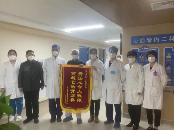 患者為90歲男性,有高血壓、低蛋白血癥等基礎病,于凌晨突發胸痛,在當地的區人民醫院診斷為“急性下壁心肌梗死”,因病情危重,緊急轉入唐山中心醫院胸痛中心,由邢佳儂團隊對其進行血栓抽吸及PTCA治療。術中發現其右冠脈中段100%閉塞,病情十分兇險,但是邢佳儂團隊不懼困難,征得患者家屬同意后,在手術風險和患者獲益之間縝密權衡,憑借高超的手術操作和豐富的臨床經驗成功實施了手術。術后,患者又經歷了心源性休克、心衰、嚴重心律失常、腎功能不全以及感染等并發癥,多次命懸一線,邢佳儂團隊通過密切協作,精準施治,一次又一次從生死線上挽救回患者的生命。經過10余天的治療與精心護理,患者身體逐漸恢復良好,已經能夠站起來行走,并在家屬的陪同下為邢佳儂團隊送上錦旗表示感謝。