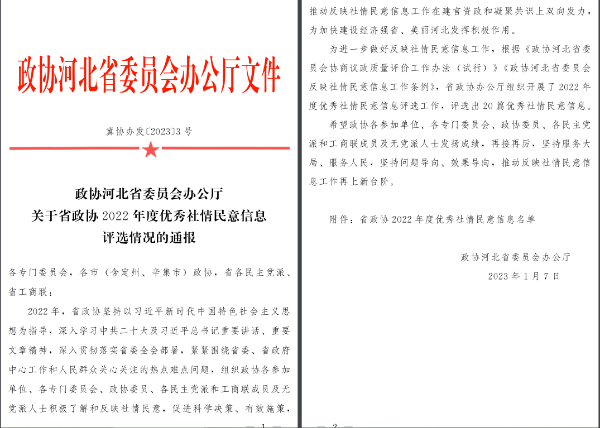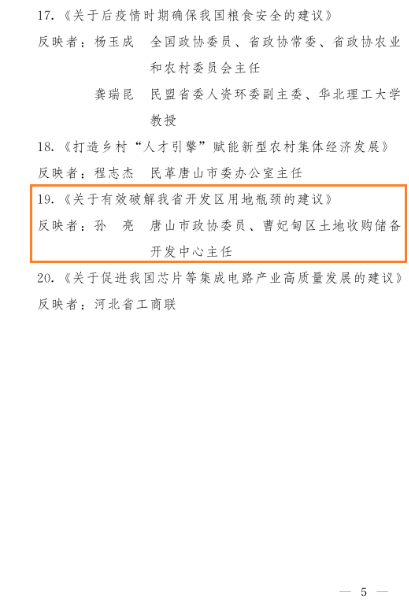 近日,為進一步做好反映社情民意信息工作,根據《政協河北省委員會協商議政質量評價工作辦法(試行)》和《政協河北省委員會反映社情民意信息工作條例》,省政協辦公廳組織開展了2022年度優秀社情民意信息評選工作,在全省范圍內評選出20篇優秀社情民意信息,唐山市政協委員、農工黨唐山市曹妃甸區支部主任、曹妃甸區土地收購儲備開發中心主任孫亮撰寫的《關于有效破解我省開發區用地瓶頸的幾點建議》名列其中。