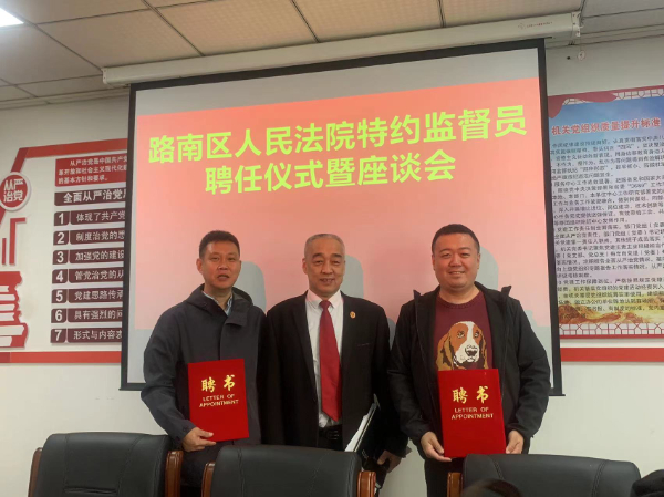 11月3日,唐山市路南區人民法院舉辦特約監督員聘任儀式暨座談會,農工黨唐山市路南區支委會主委楊小明、副主委侯波參加座談,并被聘為特約監督員。