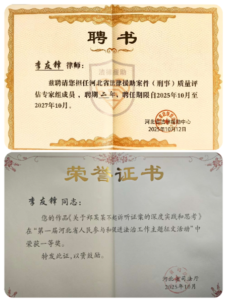 近日,農工黨唐山市綜合二支委會黨員、河北得法律師事務所副主任李友鋒榮獲“全省法律援助工作服務之星”和“第一屆河北省人民參與和促進法治工作主題征文活動”一等獎,并被聘請擔任河北省法律援助案件(刑事)質量評估專家組成員。同時榮獲多項省級殊榮,既是李友峰業務精湛、功底扎實的生動彰顯,更是對他堅守初心、積極服務社會的高度認可。