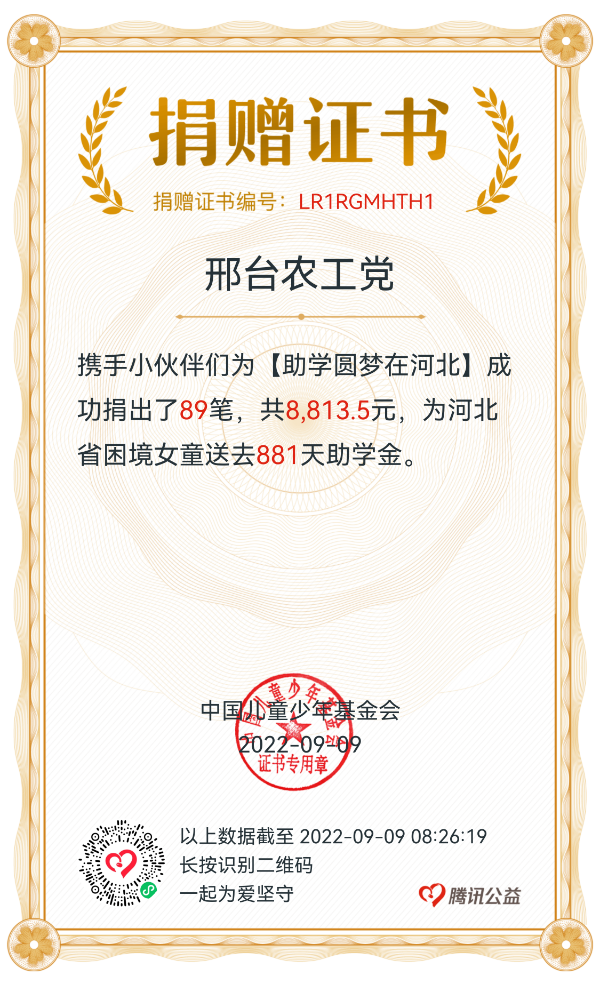 “助學(xué)圓夢”愛心募捐活動(dòng)。為幫助貧困學(xué)生實(shí)現(xiàn)大學(xué)夢,農(nóng)工黨邢臺(tái)市委積極開展“99公益日 助學(xué)圓夢”愛心募捐活動(dòng)。全市黨員積極參與募捐活動(dòng),89名黨員共募捐8813元助學(xué)金,為貧困學(xué)生籌集了881天助學(xué)金。