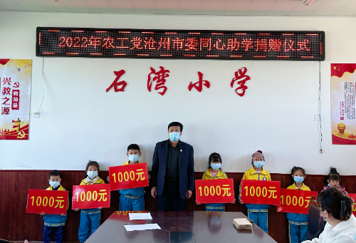 在捐贈儀式上,專職副主委胡凱代表農(nóng)工黨滄州市委向15名家庭困難學(xué)子提供助學(xué)金15000元,以及書包等文具用品,此次資助合計16000余元。專職副主委胡凱在活動中向堅守楊集鎮(zhèn)石灣中心小學(xué)的老師們致以崇高敬意,勉勵學(xué)生們要珍惜學(xué)習(xí)機會,樹立遠大理想,爭做新時代好少年,長大后成為對社會有用的人才。鹽山縣楊集鎮(zhèn)石灣中心小學(xué)校長邵長興對農(nóng)工黨滄州市委的善舉表示了熱烈的歡迎和誠摯的謝意,并圍繞學(xué)?;厩闆r、辦學(xué)目標(biāo)、存在困難以及今后的工作打算等方面作了詳細的介紹。