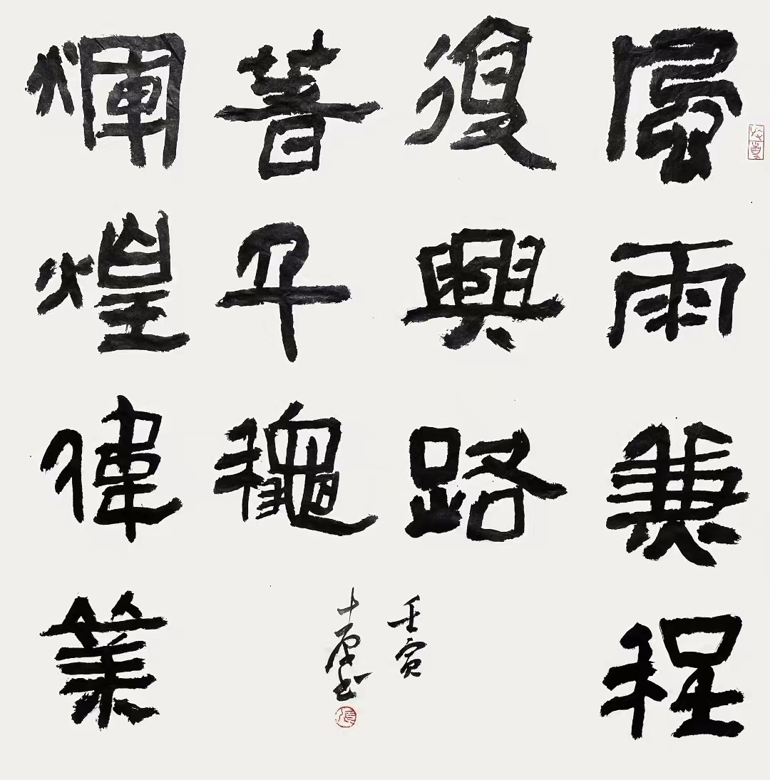 隸書作品《風雨兼程復興路 輝煌偉業著千秋》由黨員張紅武創作,以獨特龍門對聯形式書寫,歌頌在中國共產黨的領導下,中華民族實現從站起來、富起來到強起來的偉大飛躍,創造了輝煌偉業,鑄就了千秋功績。