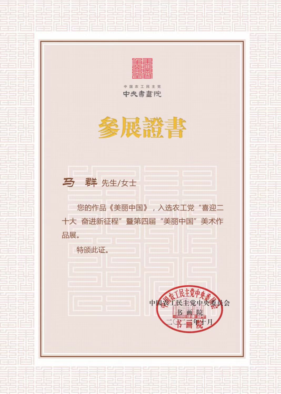 國畫作品《美麗中國》由黨員馬群創作,運用浪漫主義風格,跨越歷史時空刻畫了中國農工民主黨十任中央領導肖象,輔以青綠山水背景構成環形構圖,烘托出寫有“1949”字樣,代表“新中國成立”的紅旗,表達了中國農工民主黨始終堅定擁護中國共產黨的領導,將與中國共產黨一起為實現中華民族偉大復興的中國夢而努力奮斗。