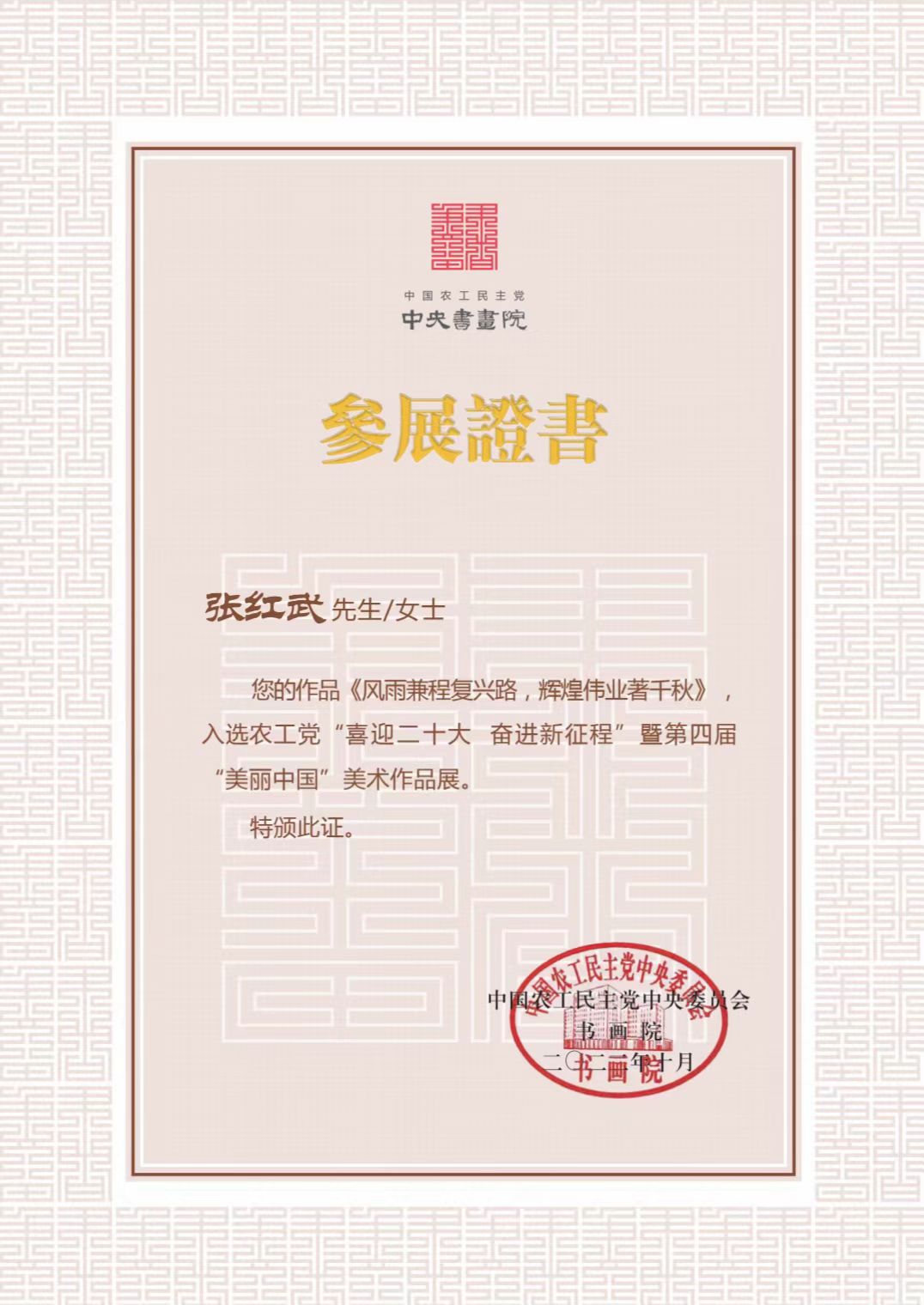為表現農工黨與中國共產黨肝膽相照、榮辱與共的合作初心,反映全國各族人民,在中國共產黨的領導下,在革命、改革事業中,在決戰決勝脫貧攻堅中,全面建設現代化過程中,涌現的新人物、新典型,取得的新成就、新作為,農工黨中央向全國農工黨黨員征集美術作品,舉辦“喜迎二十大、奮進新征程”暨第四屆“美麗中國”美術作品展。農工黨唐山市委會選送的國畫作品《美麗中國》,隸書作品《風雨兼程復興路 輝煌偉業著千秋》成功入選此次展覽。