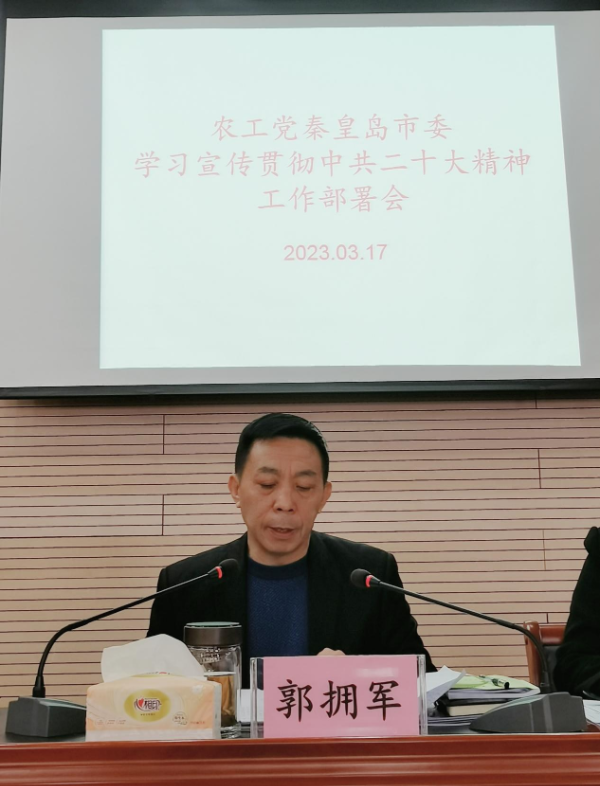 3月17日,農工黨秦皇島市委會召開學習宣傳貫徹中共二十大精神工作部署會。市政協副主席、農工黨市委主委郭擁軍主持會議,專職副主委兼秘書長陳麗娟,副主委劉瑞吉、王艷輝、宋現允、趙月參加會議。