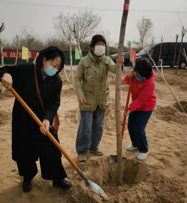 在廣陽區(qū)九州鎮(zhèn)南漢村植樹現(xiàn)場,大家三人一組,揮鍬鏟土、扶苗固根、培土夯實(shí)、提水澆灌......各個(gè)環(huán)節(jié)配合默契,干勁十足。和煦的春風(fēng)中,一排排樹苗錯(cuò)落有致、迎風(fēng)而立,形成一片美麗的“同心林”。