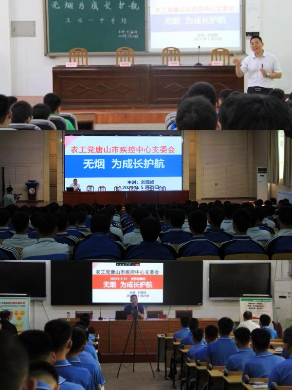 在路南區雷峰小學、遵化市職教中心、玉田縣第一中學和玉田縣職業技術教育中心,疾控中心支委會主委、醫學博士劉海峰通過現場講座與網絡直播相結合的方式,通過線上線下兩種渠道為中小學生進行健康講座。他用精準的數字和鮮活的事例講述了“煙草的歷史、煙草的危害、我國人群吸煙現狀及其嚴重性、青少年如何戒煙、二手煙及電子煙的危害”等知識,讓同學們了解了吸煙不僅有害自身健康,而且也影響他人,同時,倡導同學們培養良好生活習慣,踐行健康生活方式,樹立自己是健康第一責任人的理念,引導同學們從自身做起,做到“拒絕第一支煙”,爭做控煙先鋒。