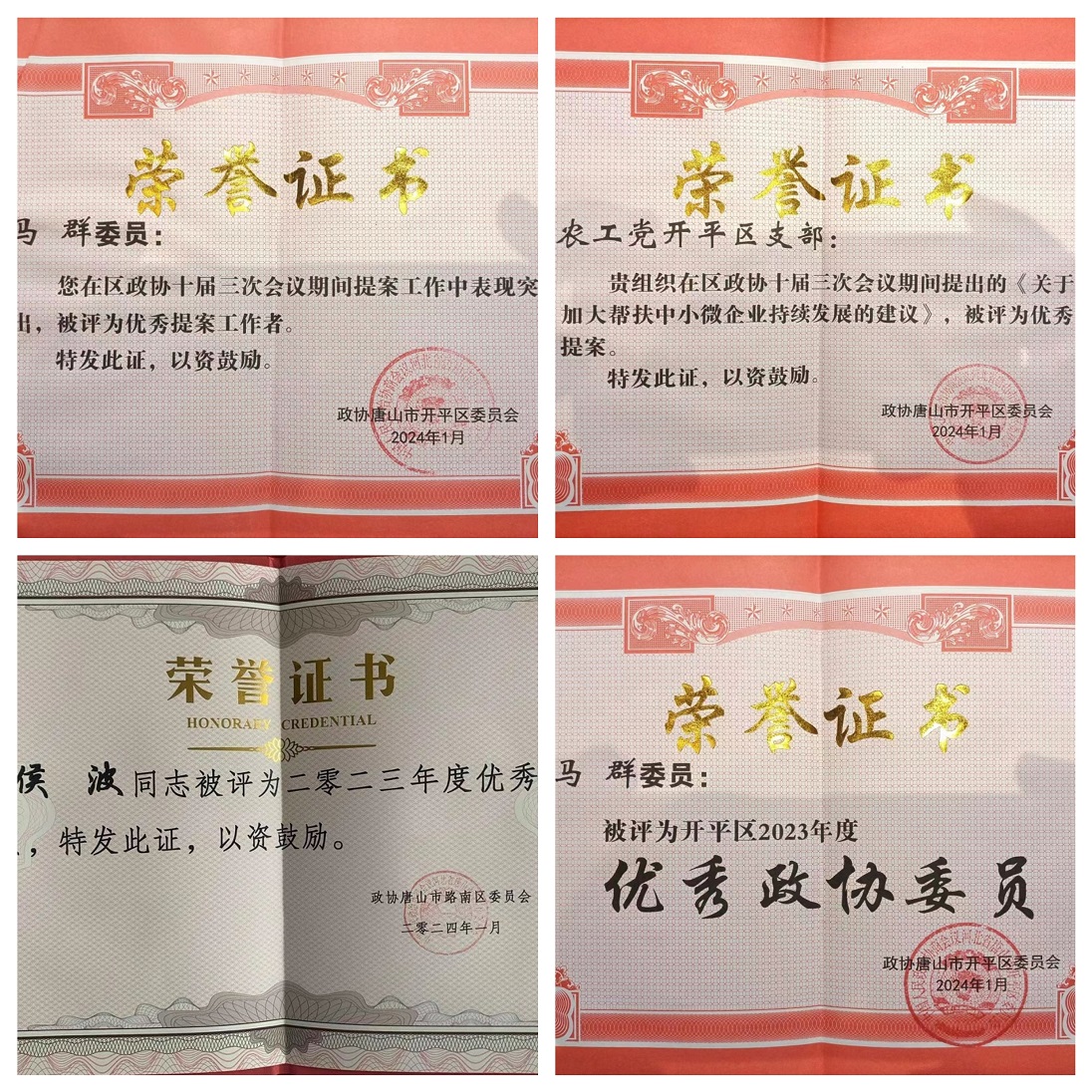 2023年,廣大農工黨界別政協委員、人大代表守正創新、履職盡責,為推動唐山經濟社會高質量發展做出了積極貢獻,在區兩會期間榮獲多項榮譽。豐南區支部張世杰委員榮獲2023年度履職工作優秀個人、2023年度反映社情民意信息先進個人;張世杰撰寫的《關于依托唐山工業互聯網平臺打通企業間信息壁壘的建議》《關于進一步優化僵尸企業退出機制的建議》、王雪松撰寫的《關于優化城市公共交通建設 不斷提升全省公共服務水平的幾點建議》、張丹撰寫的《關于進一步推動我省社區食堂建設的建議》榮獲優秀社情民意信息。路南區支委會侯波委員榮獲2023年度優秀政協委員。開平區支部馬群委員榮獲2023年度優秀政協委員、優秀提案工作者;支部提交的集體提案《關于加大幫扶小微企業持續發展的建議》榮獲優秀提案。