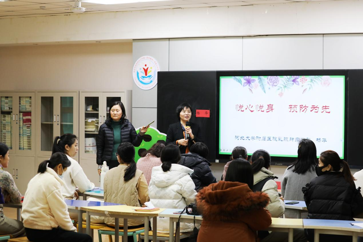 河北大學附屬醫院腫瘤內科楊華團隊及中國醫藥教育協會學雷鋒志愿服務5隊一行,在保師附校進行乳腺與多學科疾病預防宣講、義診及家庭健康管理綜合指導。農工黨河北大學附屬醫院北院支委會主委、河北大學附屬醫院腫瘤內科主任楊華結合國家指南和臨床經驗,為保師附校的女教職工進行了系統化的科普,詳細介紹了女性乳腺健康與乳腺癌防治知識,并結合生活中的實例,從保持健康生活方式、合理膳食、鍛煉保健、情緒調節以及定期科學體檢等方面逐一進行了科普解答。活動中,組織者建立了微信群,方便大家通過復聽功能應用健康常識。