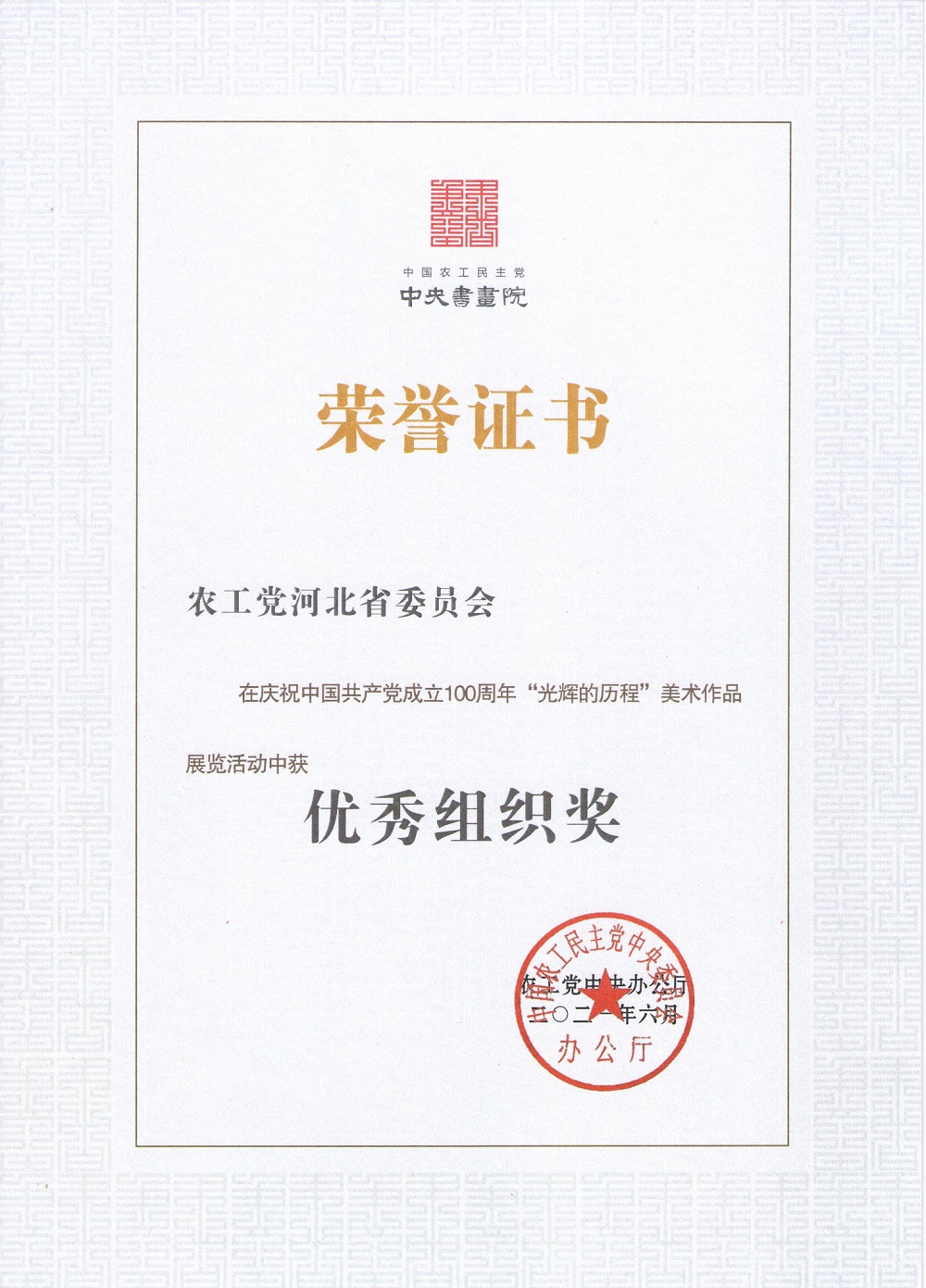 為隆重慶祝中國共產黨成立100周年,謳歌中國共產黨百年波瀾壯闊的光輝歷程和豐功偉績,全面回顧農工黨同中國共產黨團結合作的奮斗歷程,農工黨中央舉辦慶祝中國共產黨成立100周年“光輝的歷程”美術展覽活動。農工黨河北省委會高度重視、積極響應,組織黨員中的書畫藝術工作者、愛好者精心準備了28件書畫作品參選,在活動中榮獲“優秀組織獎”。